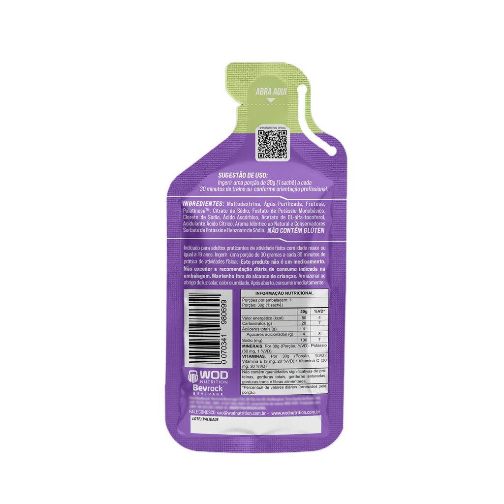 WOD RUN ENERGY GEL é um suplemento alimentar em gel pronto para consumo, desenvolvido para auxiliar na reposição de energia em treinos intensos e provas que exigem alto desempenho e resistência. Sua formulação combina carboidratos de diferentes velocidades de absorção, como maltodextrina, frutose e isomaltulose (Palatinose®), garantindo liberação gradual e contínua de energia.