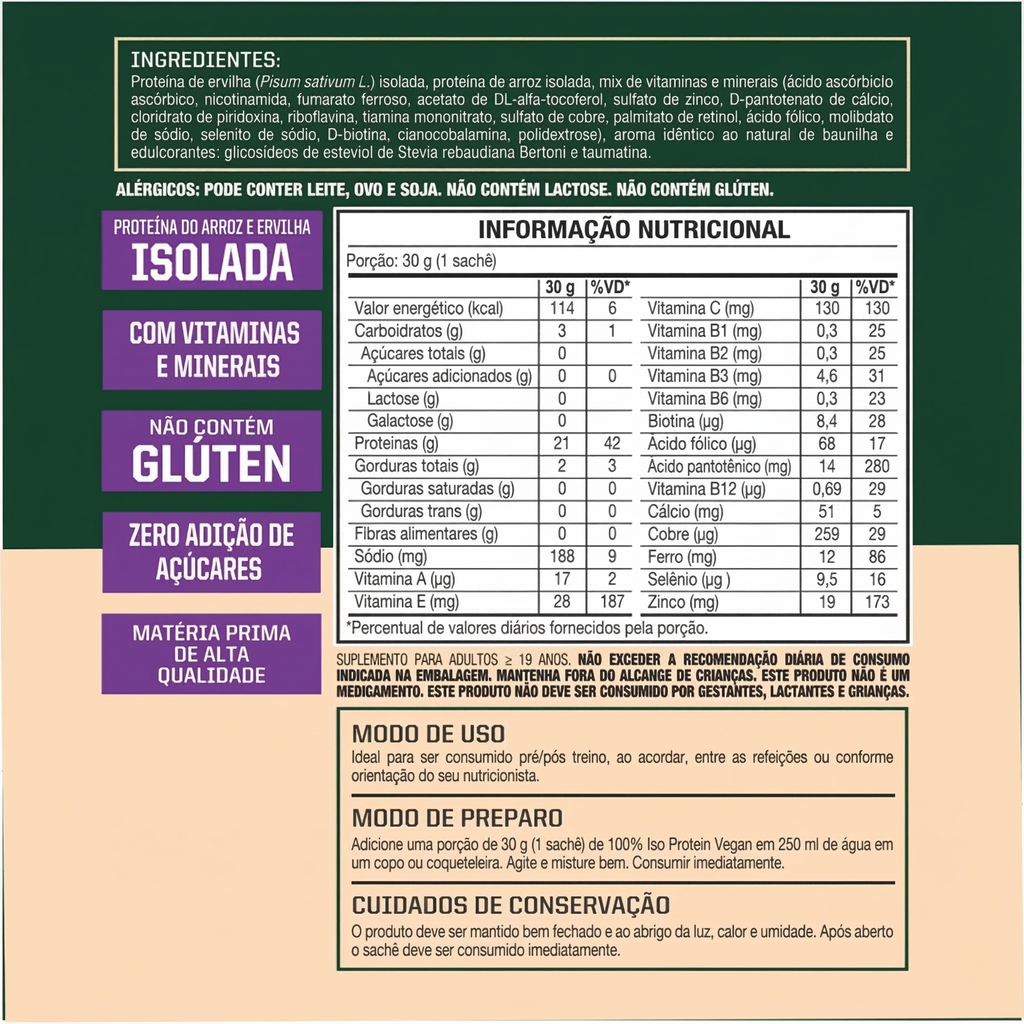 100% ISO PROTEIN VEGAN é um suplemento em pó com zero adição de açúcares, não contém glúten e contém vitaminas e minerais que auxiliam no metabolismo energético. É uma escolha estratégica para dietas veganas, vegetarianas ou para quem busca reduzir o consumo de açúcar sem abrir mão de sabor e qualidade.